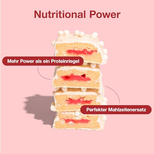 MILKprotein (25%), firming agents: maltitol (E965), glycerol (E422); white coating containing sweetener (12%) (vegetable fats (palm kernel, palm), sweetener: maltitol (E965);MILKprotein, whey powder [MILK], skimmedMILKpowder, emulsifier: sunflower lecithin), oligofructose, hydrolysed collagen (from bovine), glucose syrup, mineral blend (maltodextrin, magnesium salts of orthophosphoric acid, potassium salts of orthophosphoric acid, potassium chloride, calcium salts of orthophosphoric acid, calcium carbonate, cupric sulphate, ferric diphosphate, manganese sulphate, zinc sulphate, sodium fluoride, chromium (III) chloride, sodium molybdate, sodium selenate), cocoa butter, water, sunflower oil, protein crisps (2,5%) (whey protein [MILK], rice flour, emulsifier:SOYAlecithin), flavouring, salt, emulsifier:SOYAlecithin; vitamin blend (L-ascorbic acid, maltodextrin, DL-alpha-tocopheryl acetate, nicotinamide, potassium iodide, retinyl acetate, calcium-D-pantothenate, D-biotin, cyanocobalamin, cholecalciferol, pyridoxine hydrochloride, pteroylmonoglutamic acid, thiamin mononitrate, riboflavin, phytomenadione), colouring: carmines (E120); acidity regulator: citric acid (E330); freeze-dried raspberry powder (0,1%), sweetener: sucralose (E955). For allergens see ingredients capitalised and bold. May contain traces of eggs and soya.