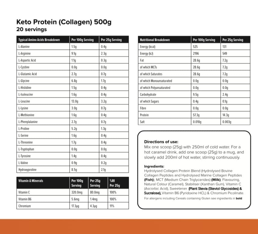 ✅ PER SERVING: 25g Keto Dose with 14000mg Hydrolysed Collagen Peptides, 6900mg Coconut MCT Oil (high C8/10), Vitamin C, Vitamin B6 and Chromium Picolinate. Includes Plant Stevia Extracts.