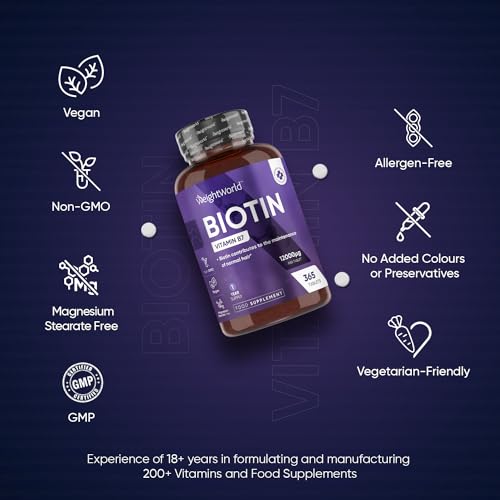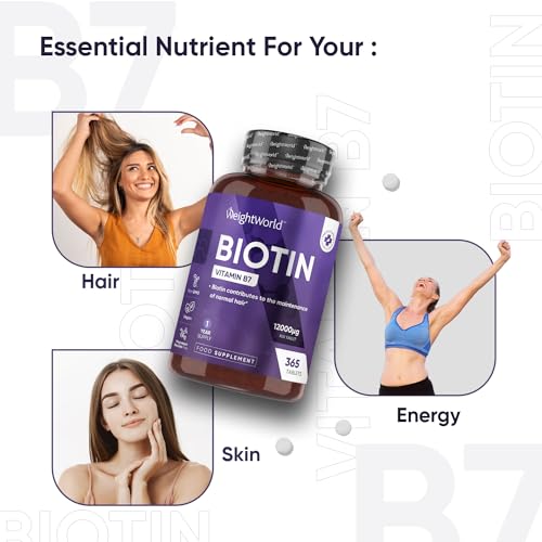 12000mcg BIOTIN TABLETS – 1 YEAR SUPPLY: Looking for an effective beauty supplement or hair growth tablets? Then, Our Biotin Hair Growth supplement is all you need. Each tablet of our high-strength biotin supplements serves Biotin 12000mcg (Vitamin B7) for incredible benefits. Each bottle contains 365 biotin tablets for hair & skin (not biotin gummies) that will replenish you for a year.