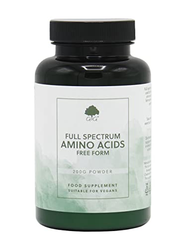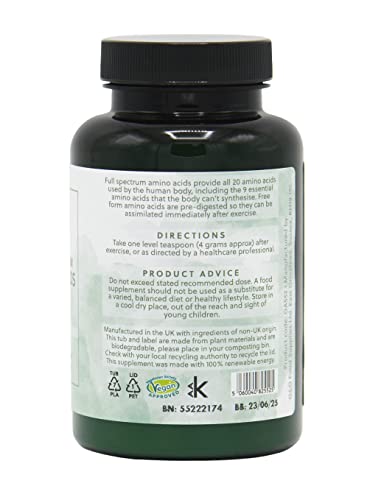 Full Spectrum Free Form Amino Acids, 200g vegan powder. All 20 amino acids in a free form state for optimum absorption. Suitable for vegans through a unique enzyme fermenation process.