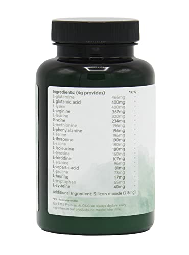 EACH LEVEL TEASPOON (4g) PROVIDES APPROX: L-glutamine 466mg, L-glutamic acid 400mg, L-lysine 400mg, L-arginine 367mg, L-leucine 320mg, Glycine 234mg, L-methionine 196mg, L-phenylalanine 196mg, L-serine 196mg, L-threonine 190mg, L-valine 180mg, L-isoleucine 180mg, L-tyrosine 160mg, L-histidine 107mg, L-alanine 96mg, L-aspartic acid 81mg, L-proline 73mg, L-taurine 57mg, L-tryptophan 55mg, L-cysteine 40mg, Additional Ingredient: Silicon Dioxide (2.8 mg)