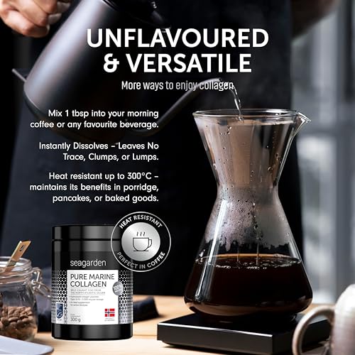 ✔ SOLUBLE & THERMOSTABLE: Unflavoured and easily mixes into hot or cold drinks like tea, coffee, juice, or smoothies, instantly dissolves for a delightful taste. Heat-resistant up to 300°C, perfect for daily collagen boost options in bakes and dishes. Just 5g (1 tbsp) gives you 5000mg of Hydrolysed Marine Collagen, higher concentration, better value.