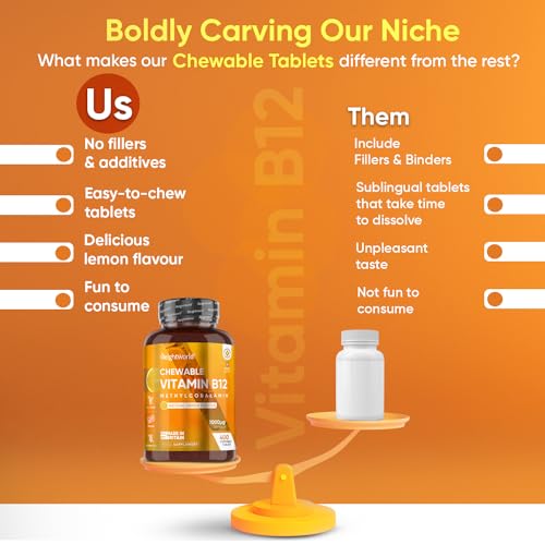 REFRESHING LEMON-FLAVOURED VITAMIN B12 SUPPLEMENTS: Our Methylcobalamin B12 supplements (not Vitamin B12 liquid drops) offer a delightful lemon flavour & have a satisfying chewy texture, making them a better choice than traditional Vitamin B12 sublingual tablets that are hard to swallow. Our chewable Vitamin B12 tablets high strength are a great alternative to sublingual B12 Methylcobalamin, which is bitter. Consume a single high-strength Vitamin B12 tablet daily for your energy & brain health.