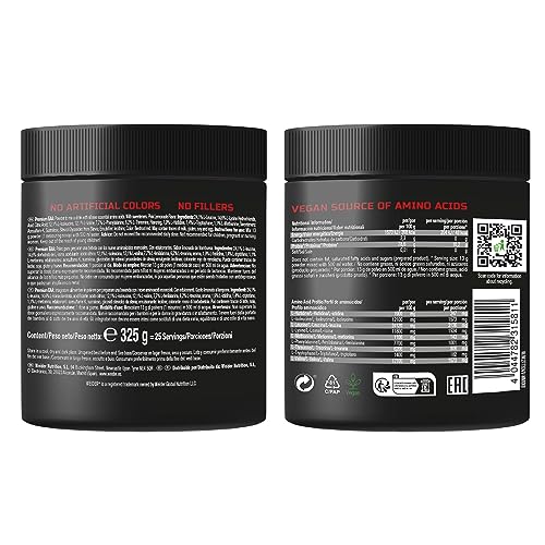 24,1% L-Leucine, 14,6% L-Lysine Hydrochloride, Acid: Citric Acid; 12,1% L-Isoleucine, 12,1% L-Valine, 7,7% L-Phenylalanine, 6,2% L-Threonine, Flavoring, 1,9% L-Histidine, 1,4% L-Tryptophane, 1,1% L-Methionine, Sweeteners: Acesulfam-K, Sucralose, Steviol Glycosides from Stevia; Emulsifier: lecithins; Color: Beetroot red. May contain traces of milk, gluten, soy and egg.